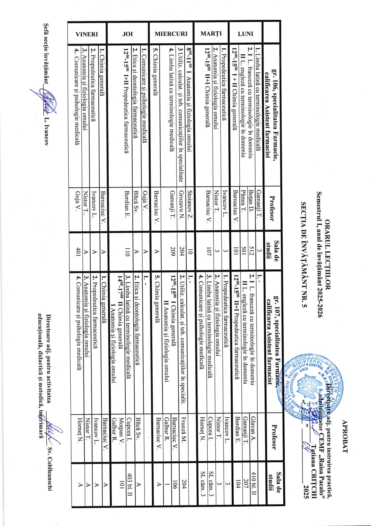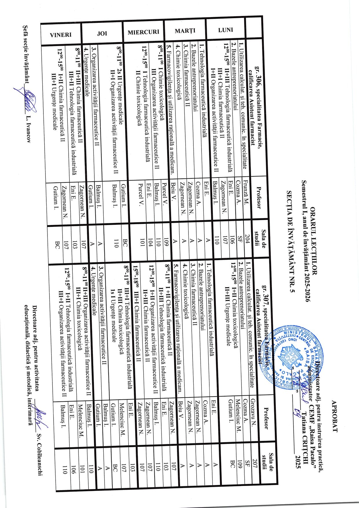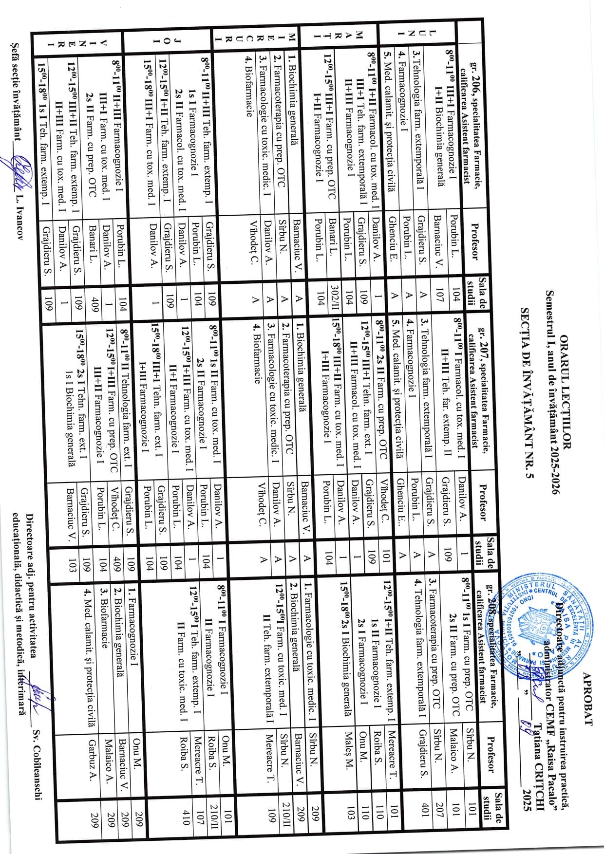 Secția de învățământ nr. 5 organizează managementul procesului educațional al elevilor de la programul de formare profesională 0916.1 Farmacie, specialitatea 0916.1.1 Asistent farmacist/asistentă farmacistă. Acesta are ca scop formarea și dezvoltarea cunoștințelor, capacităților, comportamentelor necesare competențelor profesionale în exersarea profesiei din domeniul farmaceutic.
