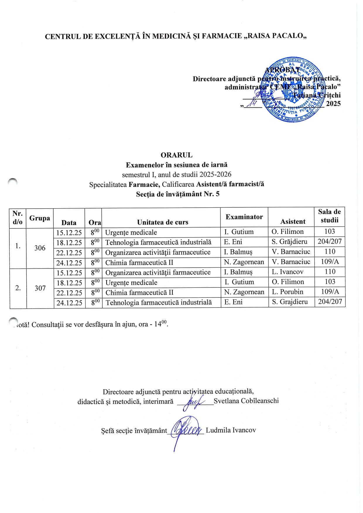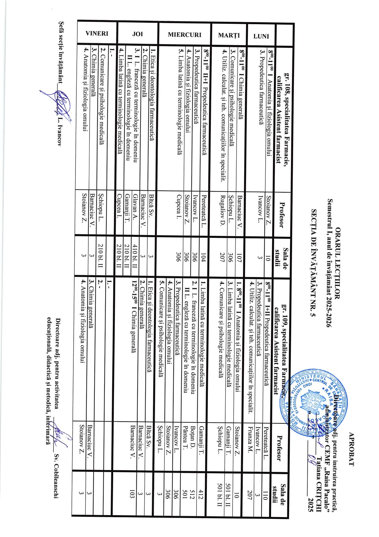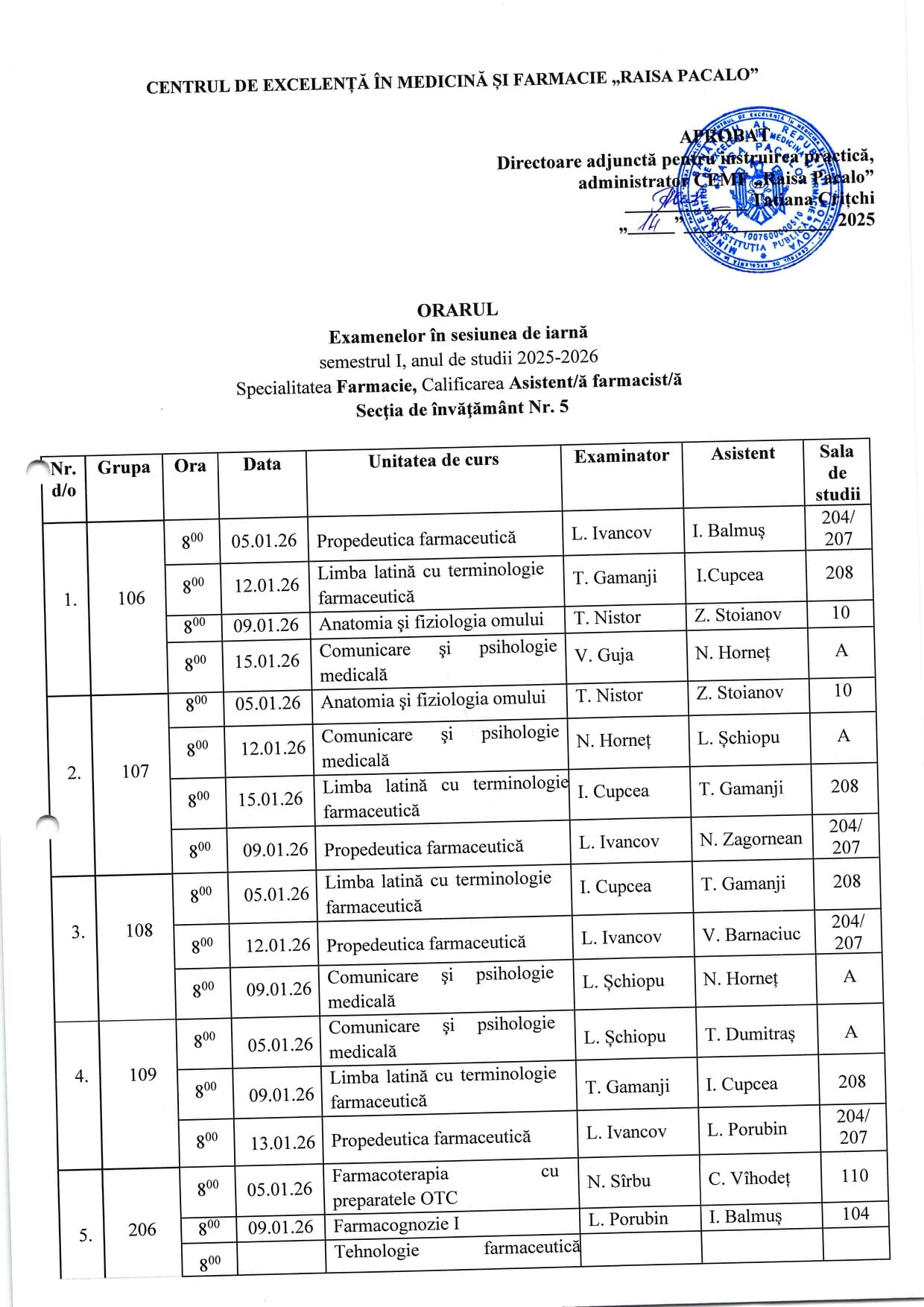 Secția de învățământ nr. 5 organizează managementul procesului educațional al elevilor de la programul de formare profesională 0916.1 Farmacie, specialitatea 0916.1.1 Asistent farmacist/asistentă farmacistă. Acesta are ca scop formarea și dezvoltarea cunoștințelor, capacităților, comportamentelor necesare competențelor profesionale în exersarea profesiei din domeniul farmaceutic.